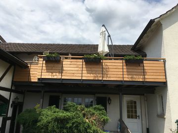 Statische Berechnung, Übersichts- und Werkplanung, Lieferung des verzinkten und beschichteten Stahls für die Balkonkonstruktion, Belag aus Holz, Geländer mit Holzverkleidung sowie Treppenkonstruktion mit Gitterroststufen und Handlauf mit Edelstahlseilen mit Montageleitung zur bauseitigen Montage.